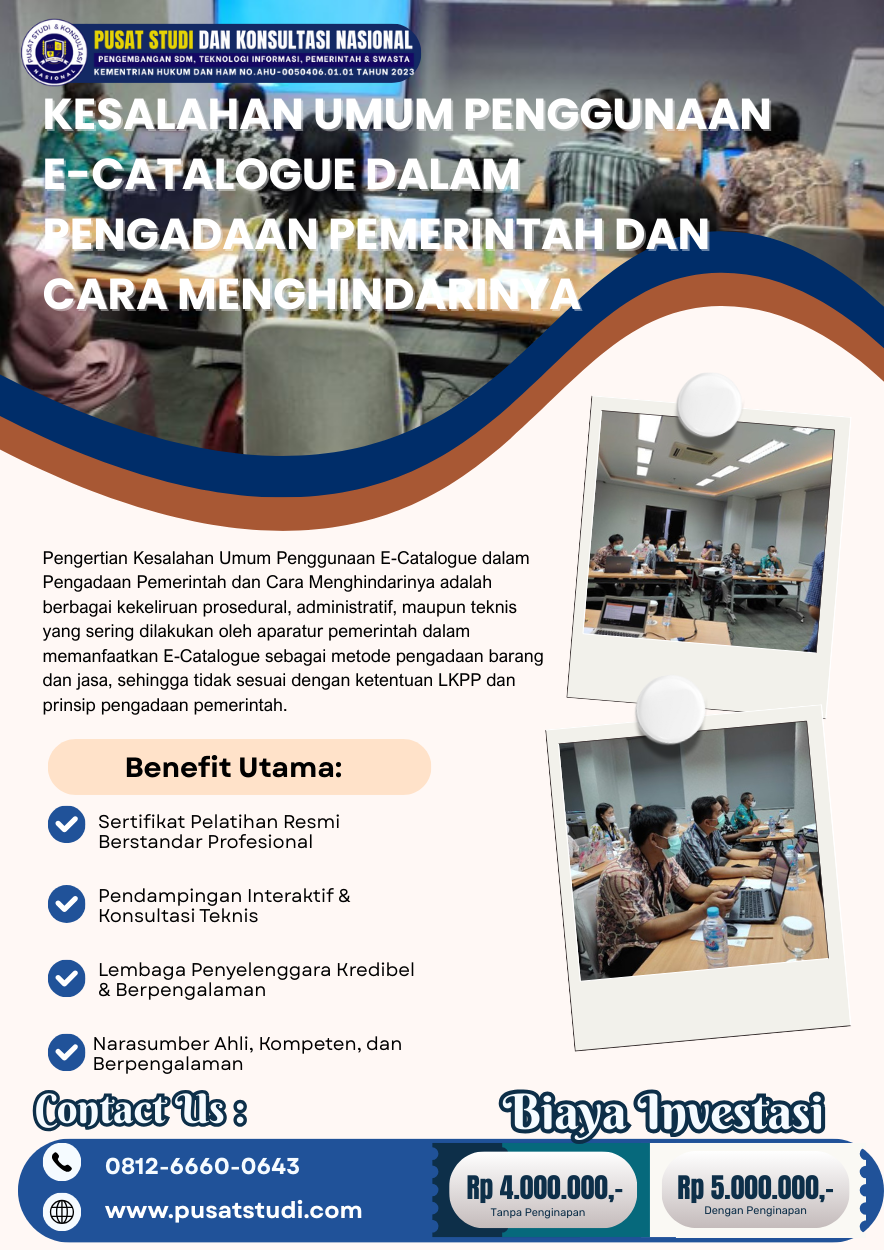 Artikel ini membahas secara komprehensif berbagai kesalahan umum dalam penggunaan E-Catalogue, penyebab terjadinya kesalahan tersebut, serta strategi dan langkah konkret untuk menghindarinya. Pemahaman ini menjadi bagian penting dari penguatan kapasitas aparatur sebagaimana dibahas dalam Bimtek E-Catalogue & SPSE: Panduan Lengkap Pengadaan Barang dan Jasa Pemerintah yang Transparan dan Akuntabel.