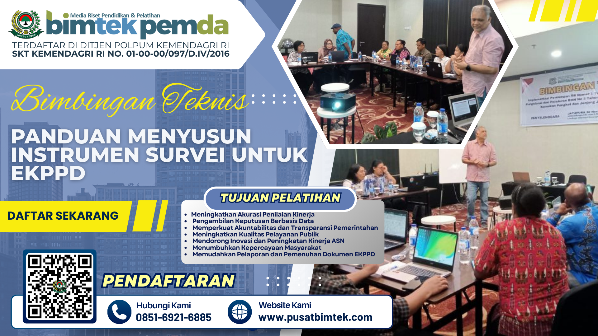 Untuk pelatihan penyusunan instrumen dan pengelolaan survei, lembaga dapat mengikuti Bimtek Evaluasi Kinerja Penyelenggaraan Pemerintahan Daerah (EKPPD) yang memberikan panduan teknis serta simulasi penyusunan instrumen berbasis standar nasional.