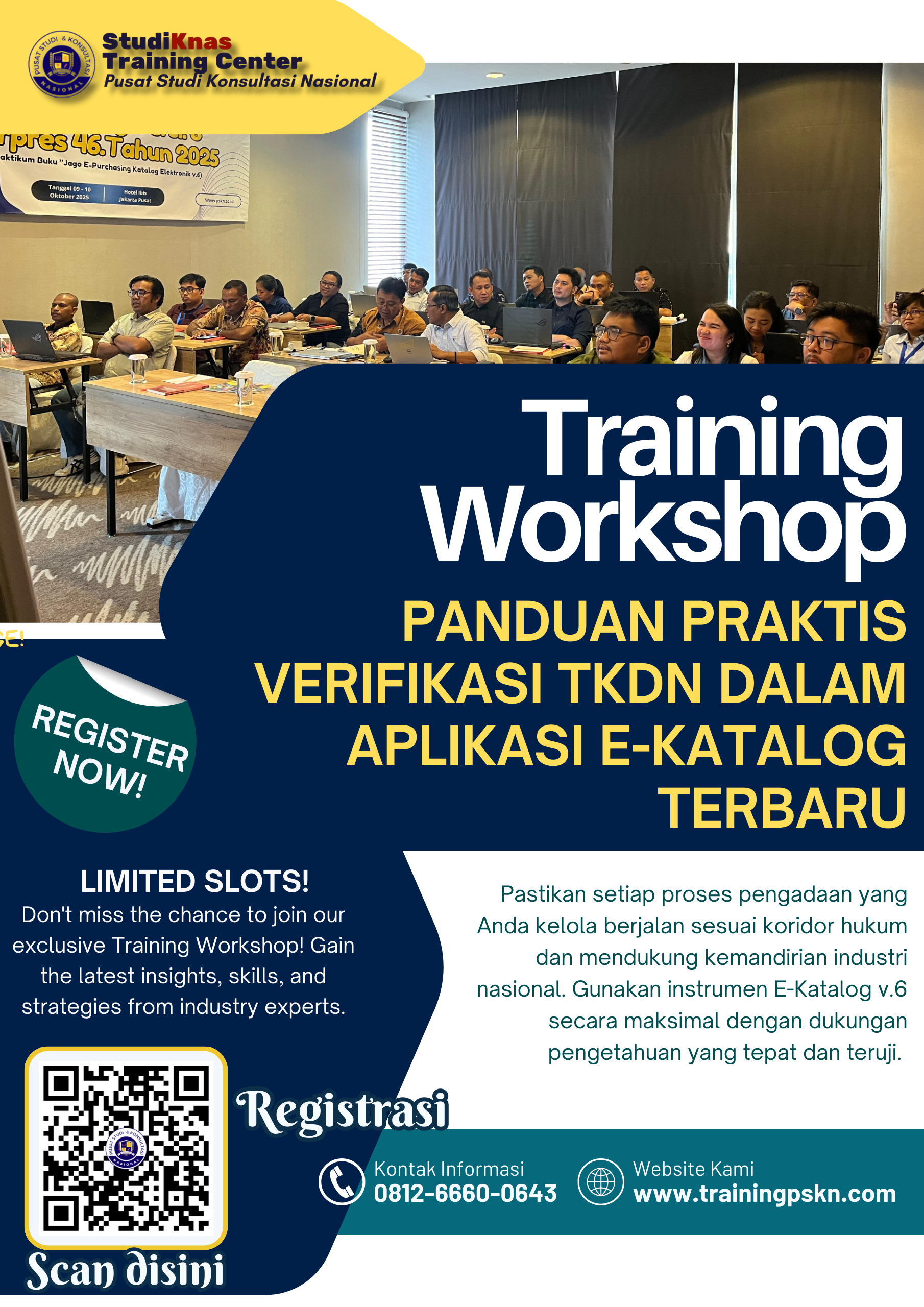 Pastikan setiap proses pengadaan yang Anda kelola berjalan sesuai koridor hukum dan mendukung kemandirian industri nasional. Gunakan instrumen E-Katalog v.6 secara maksimal dengan dukungan pengetahuan yang tepat dan teruji. Jangan biarkan kesalahan administratif menghambat target serapan anggaran instansi Anda. Segera bekali diri Anda dengan kemampuan praktis melalui bimbingan teknis terbaik untuk menjamin tatakelola pengadaan yang bersih, transparan, dan akuntabel. Daftarkan diri Anda sekarang melalui https://bit.ly/training-PBJ2026 atau hubungi layanan informasi di 0812 6660 0643 untuk jadwal pelatihan di Medan bersama narasumber ahli LKPP. Kunjungi www.trainingpskn.com untuk informasi pendaftaran lebih lanjut.