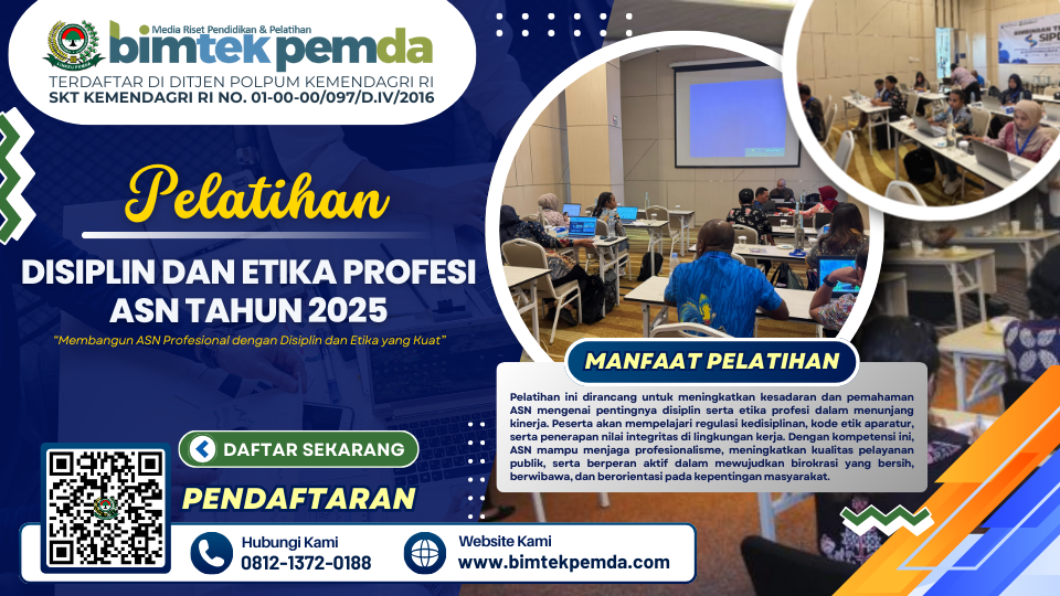 Pelatihan Disiplin dan Etika Profesi ASN merupakan investasi penting untuk membangun birokrasi yang berintegritas, profesional, dan berorientasi pada pelayanan publik. Sehubungan dengan itu kami dari Pusat Diklat dan Bimtek Pemerintahan Lembaga Informasi Keuangan Pembangunan Daerah (BIMTEK PEMDA) selaku penyelenggara kegiatan serta dukungan narasumber yang berkompeten dibidangnya, Mengundang Bapak/Ibu untuk mengikuti kegiatan “PELATIHAN DISIPLIN DAN ETIKA PROFESI ASN TAHUN 2025” yang akan dilaksanakan.