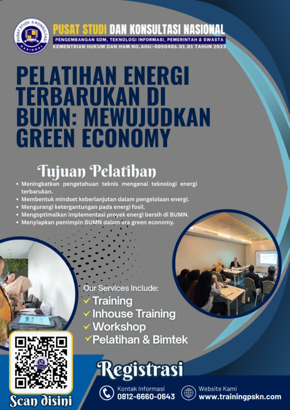 Pelatihan energi terbarukan di BUMN adalah langkah strategis dalam mendukung visi Indonesia menuju green economy. Dengan SDM yang terlatih, teknologi yang tepat, dan dukungan regulasi, BUMN dapat menjadi motor utama dalam transisi energi nasional.