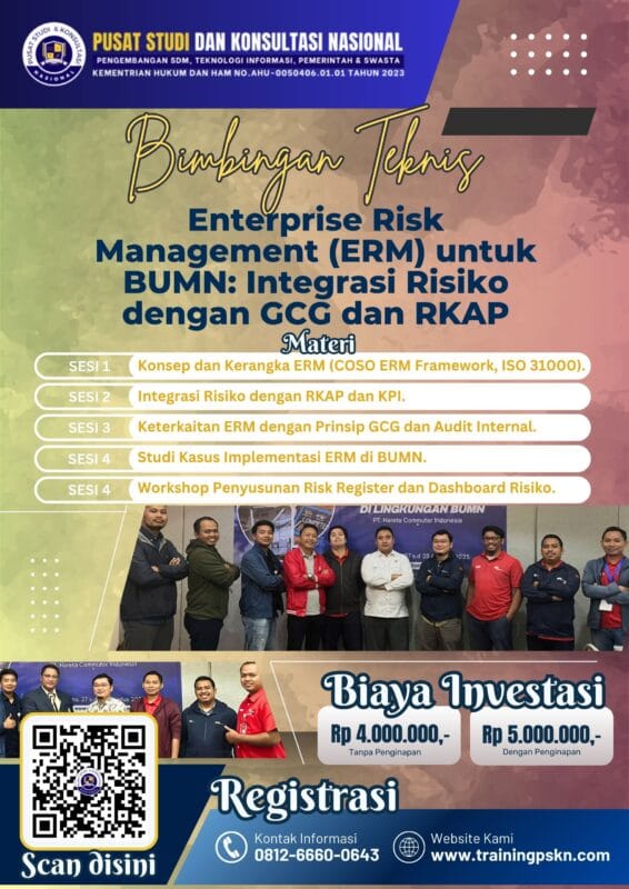 💡 Tingkatkan kapabilitas pengelolaan risiko perusahaan Anda dengan mengikuti Bimtek Enterprise Risk Management (ERM) untuk BUMN, dan wujudkan tata kelola korporasi yang profesional, transparan, serta berdaya saing tinggi.