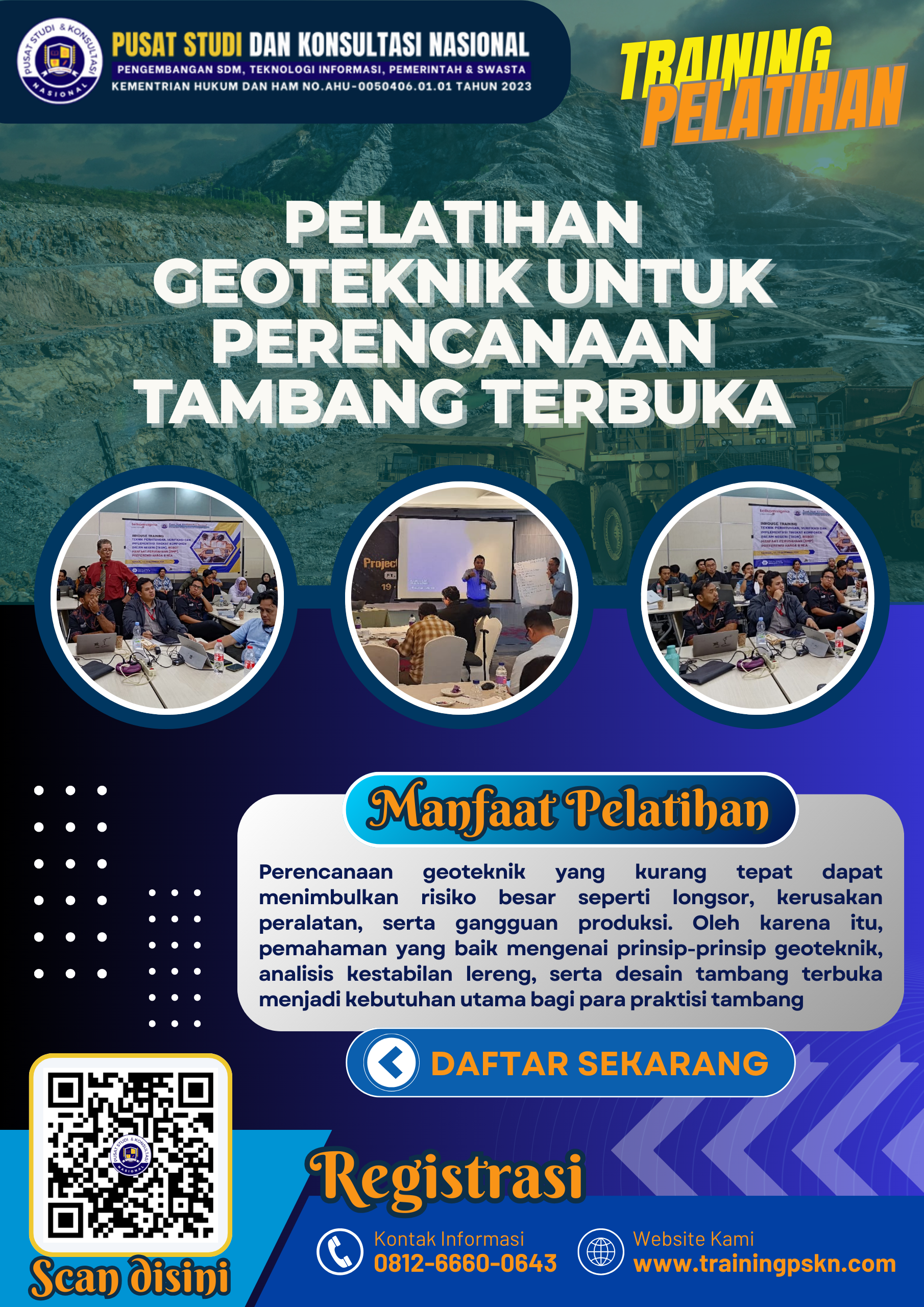Pelatihan ini dirancang untuk membekali peserta dengan pengetahuan dan keterampilan praktis dalam menerapkan metode geoteknik yang sesuai dengan standar industri dan regulasi keselamatan pertambangan.