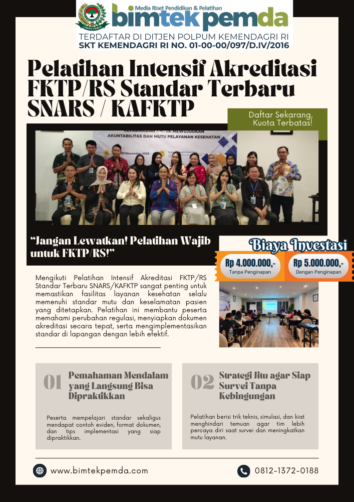 Melalui Pelatihan Intensif Akreditasi FKTP/RS, tenaga kesehatan, pimpinan, dan tim mutu mendapatkan panduan terstruktur, studi kasus, serta simulasi penyusunan dokumen dan implementasi lapangan sesuai standar mutakhir.