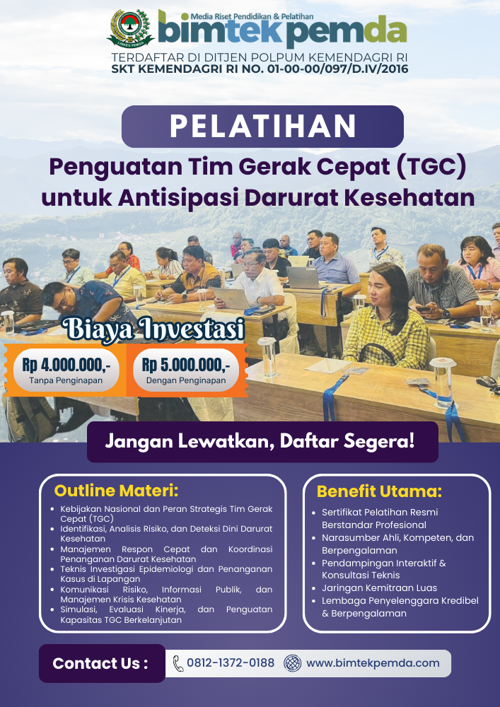 Pelatihan Penguatan Tim Gerak Cepat (TGC) untuk Antisipasi Darurat Kesehatan dirancang sebagai upaya strategis untuk meningkatkan kapasitas sumber daya manusia, sistem kerja, serta kesiapsiagaan institusi dalam menghadapi berbagai skenario kedaruratan kesehatan. Artikel ini disusun sebagai konten pilar yang komprehensif, menjadi rujukan utama bagi pemerintah daerah, dinas kesehatan, rumah sakit, dan pemangku kepentingan lainnya dalam memahami urgensi, konsep, dan implementasi pelatihan TGC secara optimal.