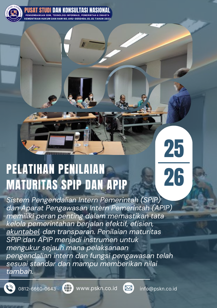 Pusat Studi dan Konsultasi Nasional (PSKN) menyelenggarakan pelatihan ini untuk membekali aparatur dengan pemahaman, teknik, dan keterampilan dalam melakukan penilaian maturitas sesuai pedoman Badan Pengawasan Keuangan dan Pembangunan (BPKP), serta mendorong peningkatan level maturitas di instansi masing-masing.