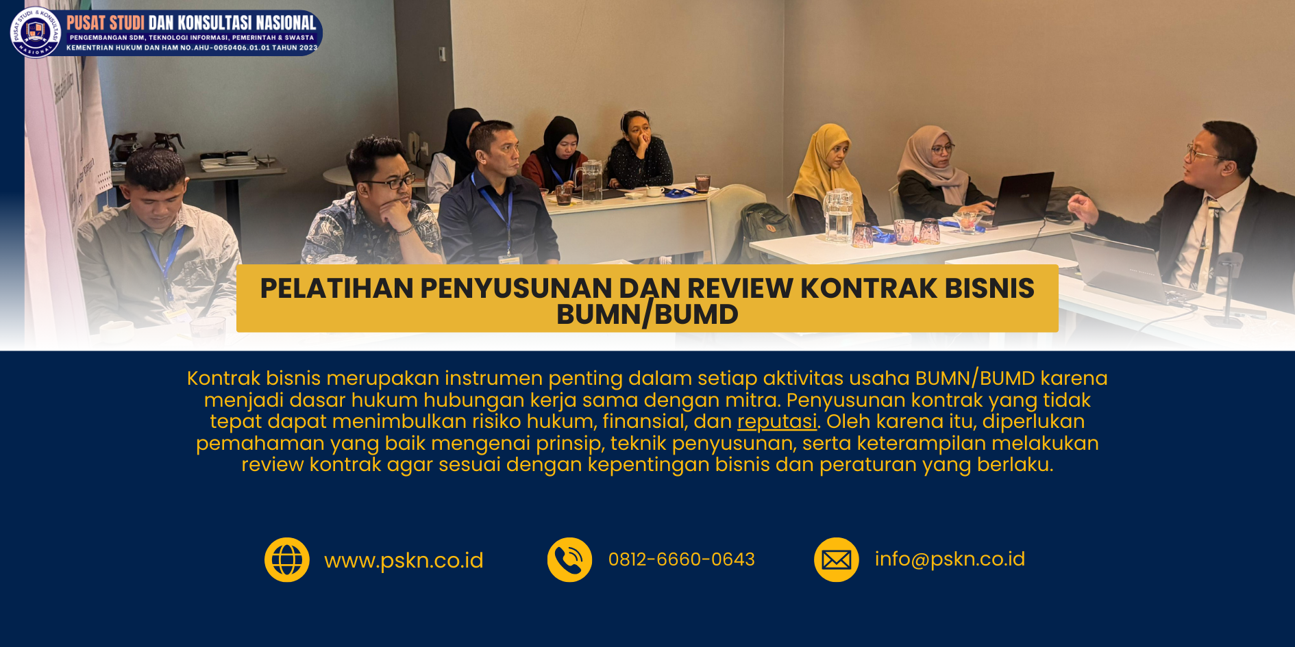 Pelatihan ini diselenggarakan oleh Pusat Studi dan Konsultasi Nasional (PSKN) sebagai upaya meningkatkan kompetensi SDM BUMN/BUMD di bidang manajemen kontrak bisnis.