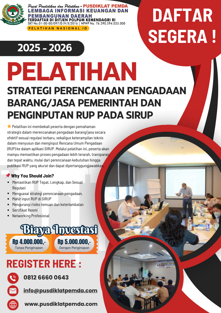 Pelatihan Strategi Perencanaan Pengadaan Barang/Jasa Pemerintah dan Penginputan RUP pada SIRUP merupakan langkah strategis untuk memperkuat tata kelola pemerintahan, meningkatkan efisiensi belanja, serta memastikan seluruh proses pengadaan berjalan transparan, akuntabel, dan sesuai dengan peraturan terbaru. Melalui pelatihan ini, perangkat daerah dapat meningkatkan kapasitas, memperbaiki kualitas perencanaan, serta menekan risiko temuan audit.