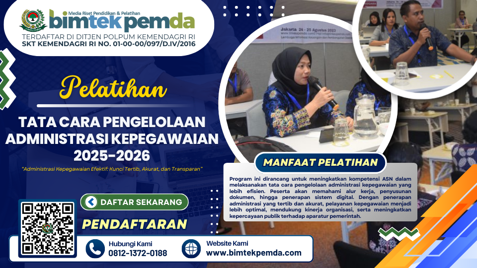 Pelatihan Tata Cara Pengelolaan Administrasi Kepegawaian merupakan upaya penting untuk meningkatkan kualitas pelayanan administrasi ASN. Sehubungan dengan itu kami dari Pusat Diklat dan Bimtek Pemerintahan Lembaga Informasi Keuangan Pembangunan Daerah (BIMTEK PEMDA) selaku penyelenggara kegiatan serta dukungan narasumber yang berkompeten dibidangnya, Mengundang Bapak/Ibu untuk mengikuti kegiatan yang akan dilaksanakan.