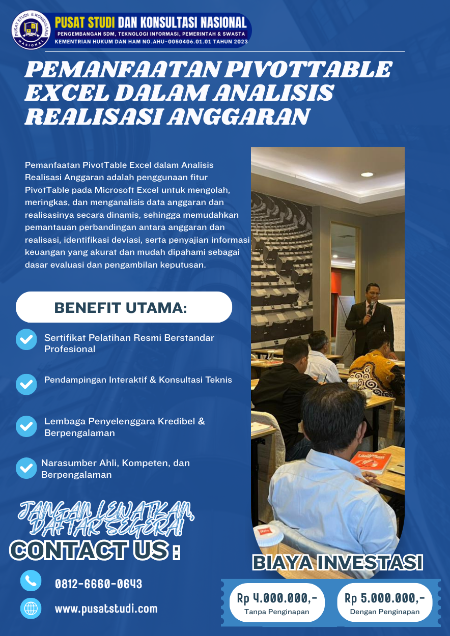 Tingkatkan kualitas analisis realisasi anggaran dan efisiensi pengelolaan keuangan organisasi Anda melalui pemanfaatan PivotTable Excel yang tepat, sistematis, dan berbasis praktik terbaik keuangan modern.