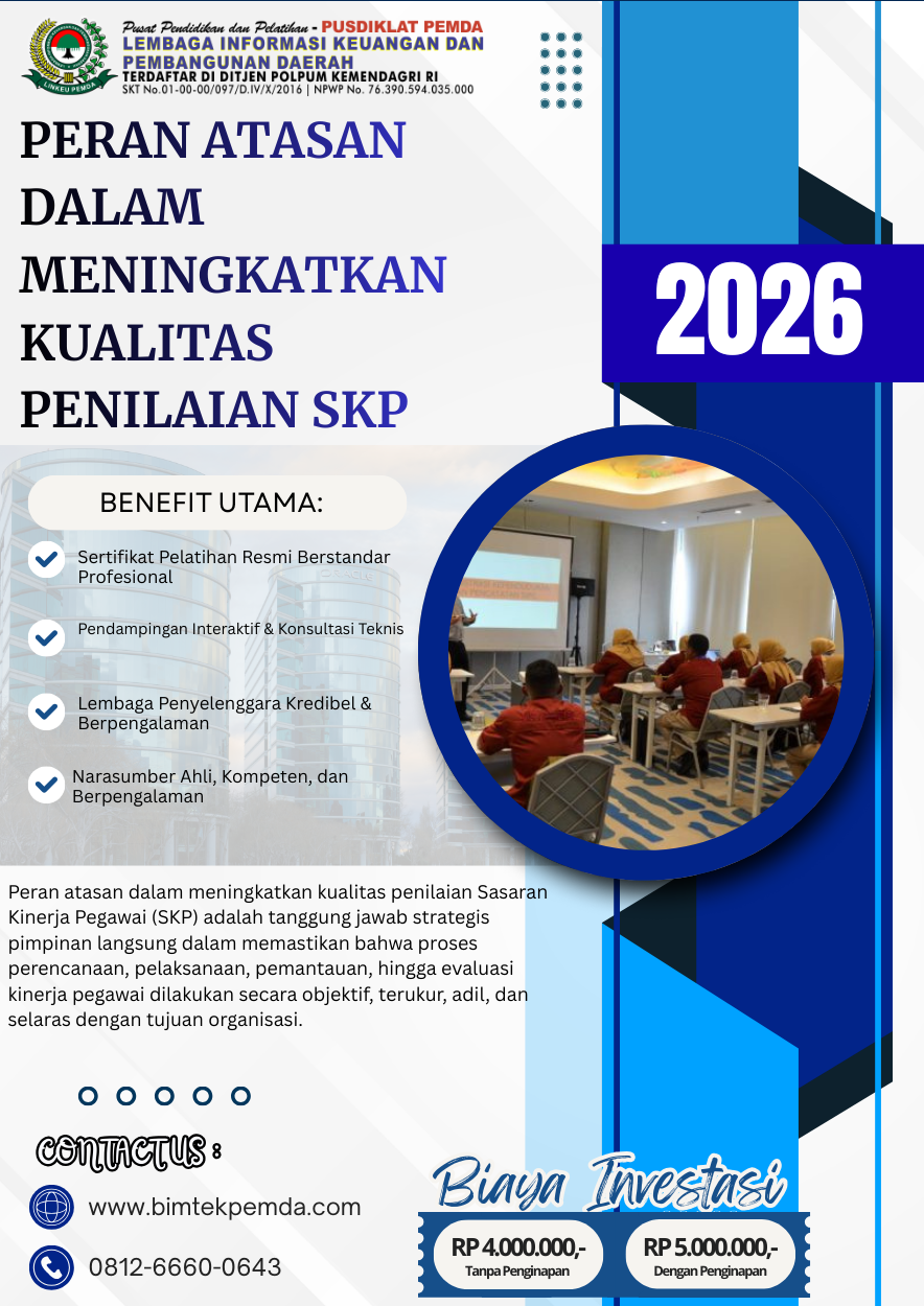 Salah satu upaya strategis adalah melalui Pelatihan Penyusunan SKP & Evidence Kinerja 2026, yang membekali pimpinan dan atasan langsung dengan pemahaman kebijakan, teknik penilaian, serta praktik terbaik dalam manajemen kinerja ASN.