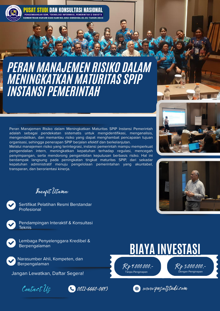 Tingkatkan maturitas SPIP instansi Anda melalui penerapan manajemen risiko yang terintegrasi dan penguatan kapasitas aparatur secara berkelanjutan melalui program bimtek yang terstruktur dan aplikatif.