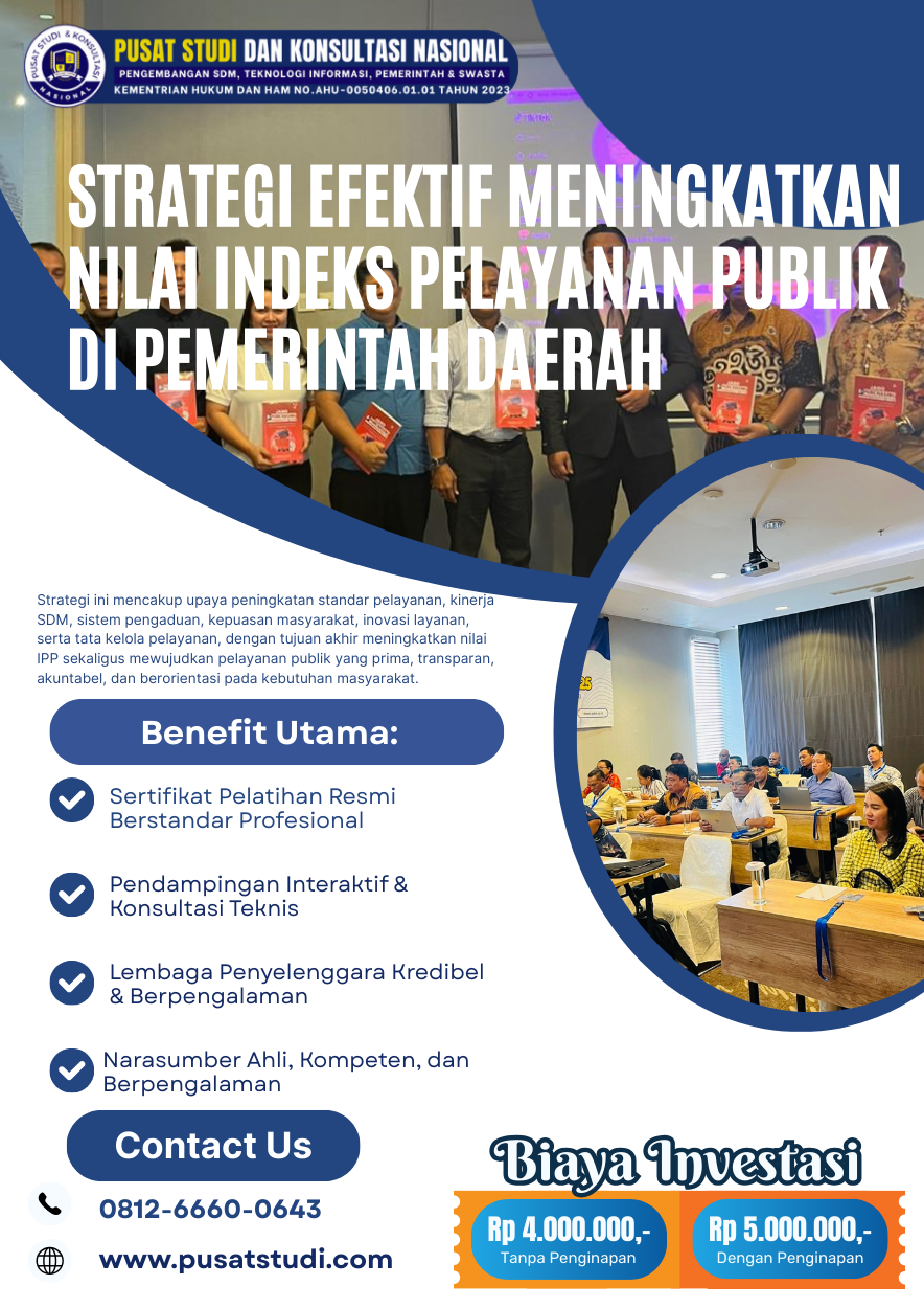 Tingkatkan kapasitas aparatur Anda melalui Bimtek Peningkatan Indeks Pelayanan Publik, perkuat strategi pelayanan daerah, dan wujudkan layanan publik yang unggul dan terpercaya.