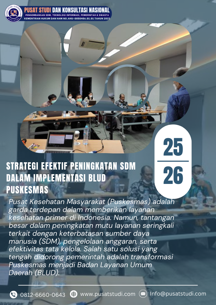 Implementasi BLUD memungkinkan Puskesmas lebih fleksibel dalam mengelola keuangan, memberikan insentif berbasis kinerja, dan meningkatkan kualitas layanan. Agar transformasi ini berjalan efektif, diperlukan strategi khusus melalui Bimbingan Teknis (Bimtek) Strategi Efektif Peningkatan SDM dalam Implementasi BLUD Puskesmas.