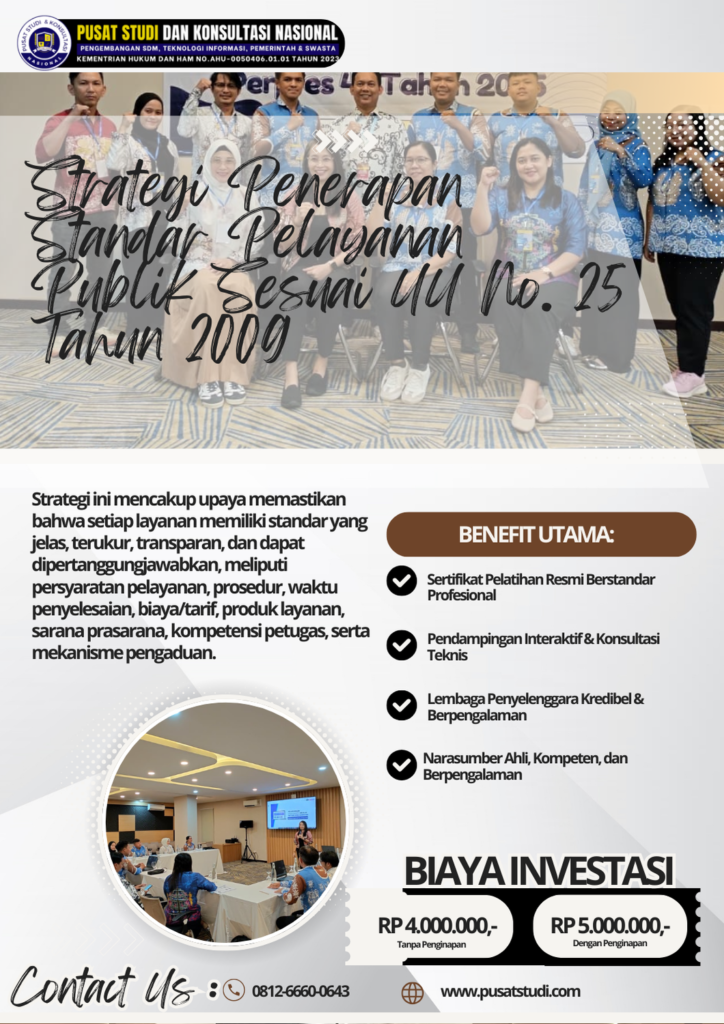 Penguatan kapasitas SDM melalui pelatihan dan bimbingan teknis menjadi kebutuhan mutlak, salah satunya melalui program Bimtek Implementasi UU No. 25 Tahun 2009 tentang Pelayanan Publik yang dirancang khusus untuk aparatur pemerintah.
