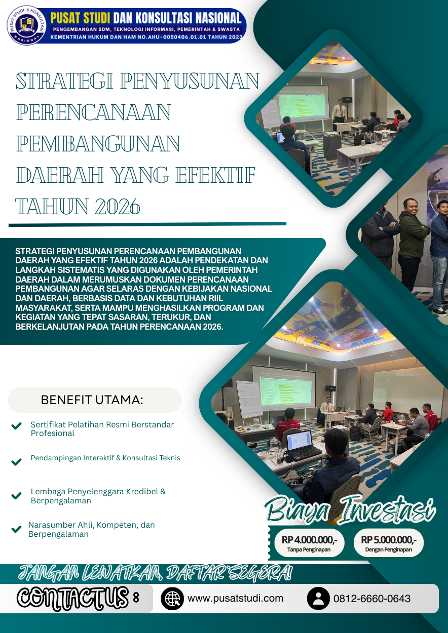 Untuk pendalaman materi perencanaan dan evaluasi pembangunan, pemerintah daerah dapat merujuk pada program peningkatan kapasitas seperti Bimtek Perencanaan & Evaluasi Pembangunan 2026 sebagai referensi penguatan kompetensi aparatur.