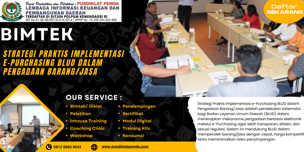 Ingin pengadaan BLUD lebih transparan, efisien, dan sesuai regulasi terbaru? Ikuti pelatihan Bimtek e-Purchasing untuk meningkatkan kompetensi tim Anda sekarang juga.