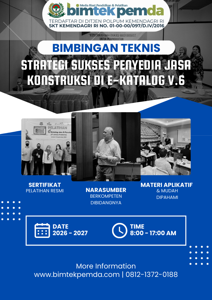 Tingkatkan pemahaman, kuasai mekanisme E-Purchasing v.6, susun strategi harga dan spesifikasi yang kompetitif, serta perkuat kapasitas melalui pembelajaran praktis agar penyedia jasa konstruksi mampu bersaing dan sukses di E-Katalog v.6 secara berkelanjutan.
