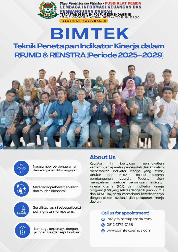 Tingkatkan kemampuan tim perencana daerah Anda dalam menyusun indikator kinerja yang terukur, efektif, dan akuntabel melalui kegiatan Bimtek Pedoman dan Teknik Penyusunan RPJMD & RENSTRA Tahun 2025–2029.