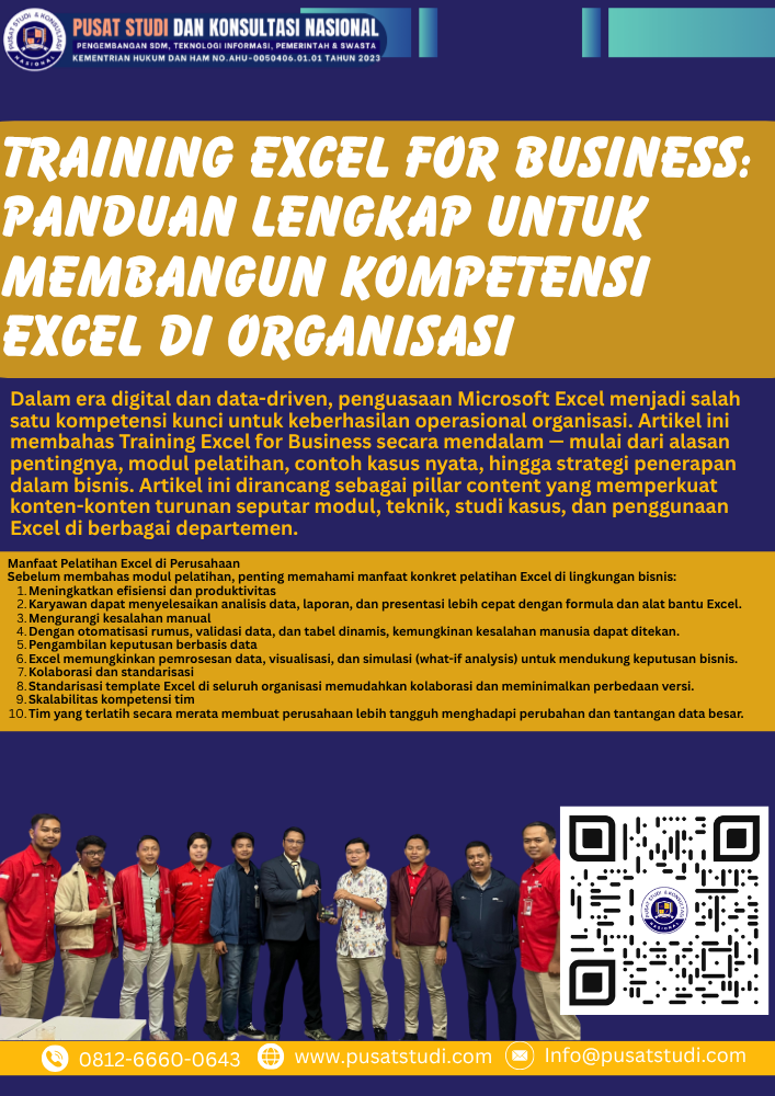 Dalam era digital dan data-driven, penguasaan Microsoft Excel menjadi salah satu kompetensi kunci untuk keberhasilan operasional organisasi. Artikel ini membahas Training Excel for Business secara mendalam — mulai dari alasan pentingnya, modul pelatihan, contoh kasus nyata, hingga strategi penerapan dalam bisnis. Artikel ini dirancang sebagai pillar content yang memperkuat konten-konten turunan seputar modul, teknik, studi kasus, dan penggunaan Excel di berbagai departemen.