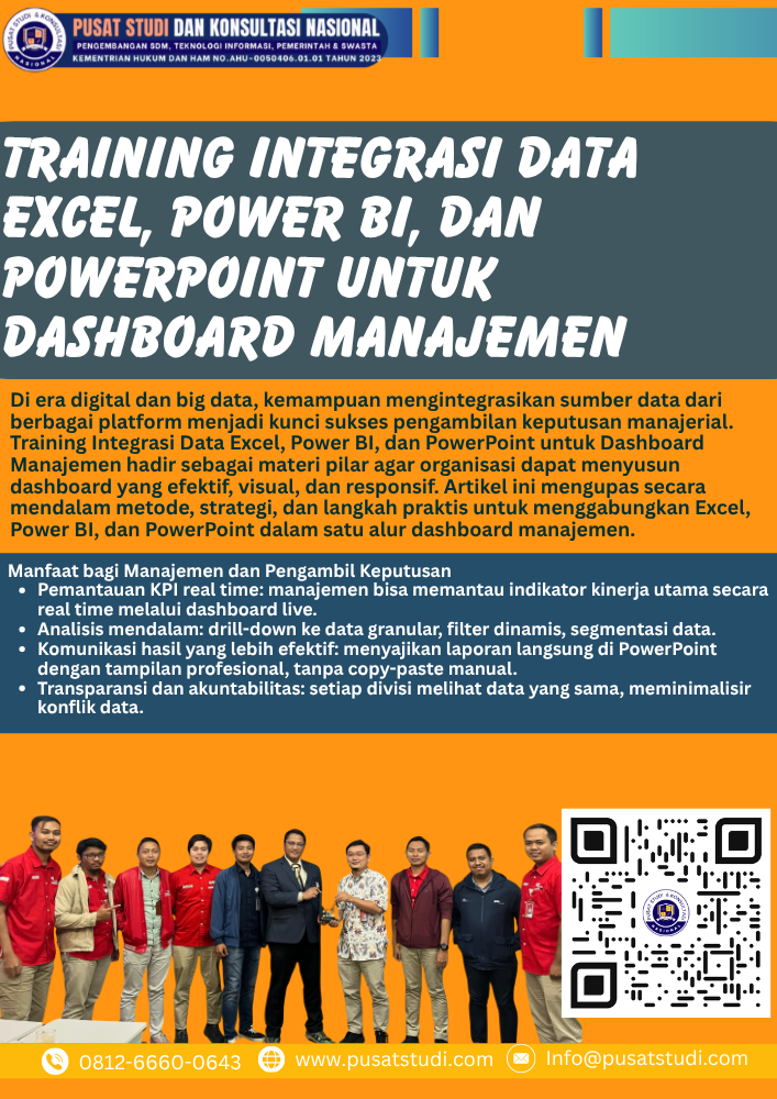 Di era digital dan big data, kemampuan mengintegrasikan sumber data dari berbagai platform menjadi kunci sukses pengambilan keputusan manajerial. Training Integrasi Data Excel, Power BI, dan PowerPoint untuk Dashboard Manajemen hadir sebagai materi pilar agar organisasi dapat menyusun dashboard yang efektif, visual, dan responsif. Artikel ini mengupas secara mendalam metode, strategi, dan langkah praktis untuk menggabungkan Excel, Power BI, dan PowerPoint dalam satu alur dashboard manajemen.