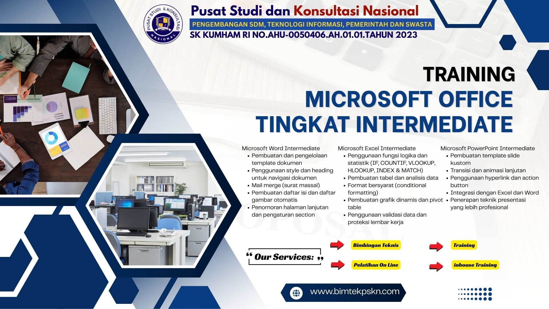 Training Microsoft Office Tingkat IntermediateSehubungan dengan hal tersebut diatas, kami dari Pusat Studi Konsultasi Nasional (PSKN), Selaku penyelenggara kegiatan serta dukungan  narasumber yang berkompoten dibidangnya, Mengudang Bapak/Ibu untuk mengikuti kegiatan bimtek nasional dengan Tema : “Training Microsoft Office Tingkat Intermediate” untuk informasi lebih lanjut dapat menghubungi: