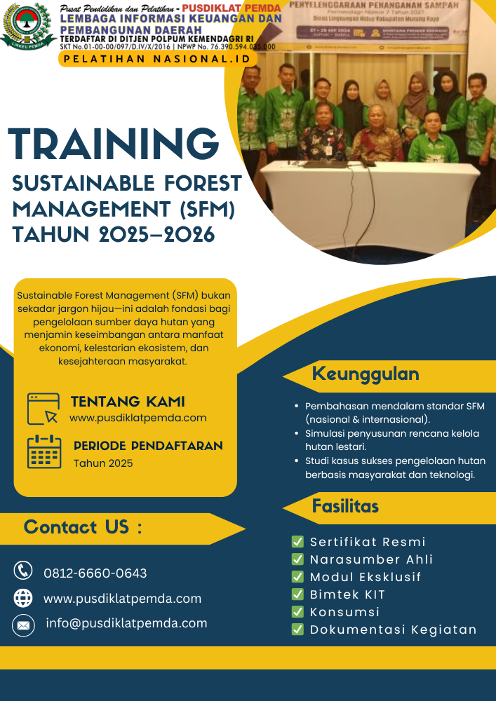 Sehubungan hal tersebut kami dari Pusat Pendidikan Keuangan Dan Pelatihan Pemerintahan Daerah (PUSDIKLAT PEMDA) Selaku penyelenggara kegiatan serta dukungan narasumber yang berkompeten dibidangnya, Mengundang Bapak/Ibu untuk mengikuti kegiatan ”Training Sustainable Forest Management (SFM) Tahun 2025–2026″ untuk pendaftaran silahkan menghubungi kami.