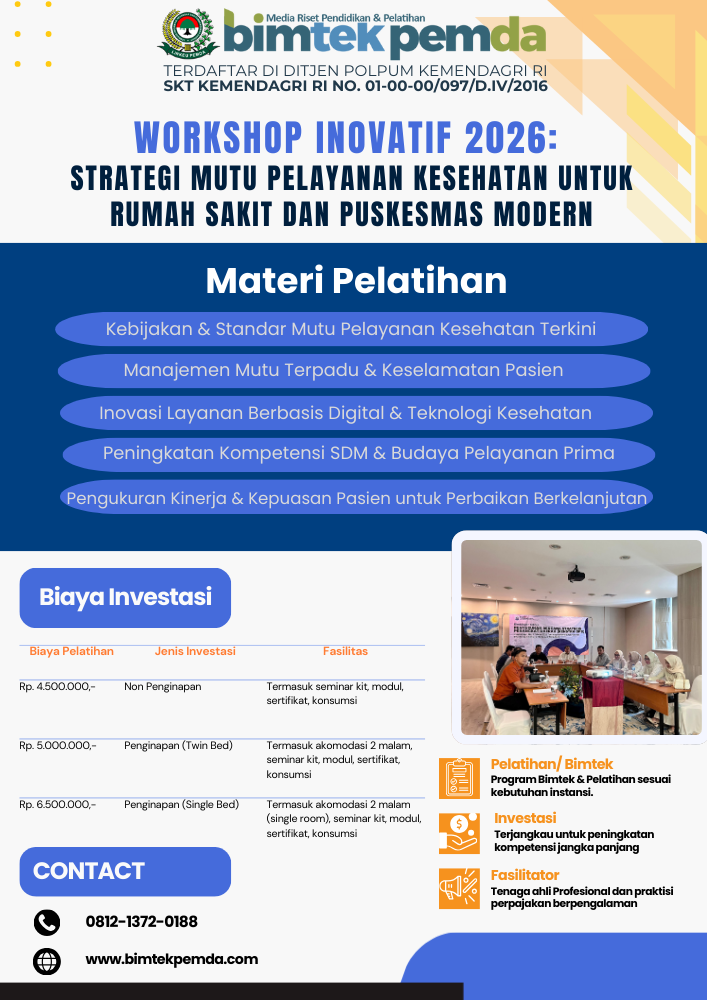 Workshop Inovatif 2026: Strategi Mutu Pelayanan Kesehatan untuk Rumah Sakit dan Puskesmas Modern merupakan langkah strategis untuk menjawab tantangan layanan kesehatan masa kini. Dengan penguatan mutu, keselamatan pasien, inovasi, dan transformasi digital, fasilitas kesehatan dapat meningkatkan kualitas layanan secara signifikan.